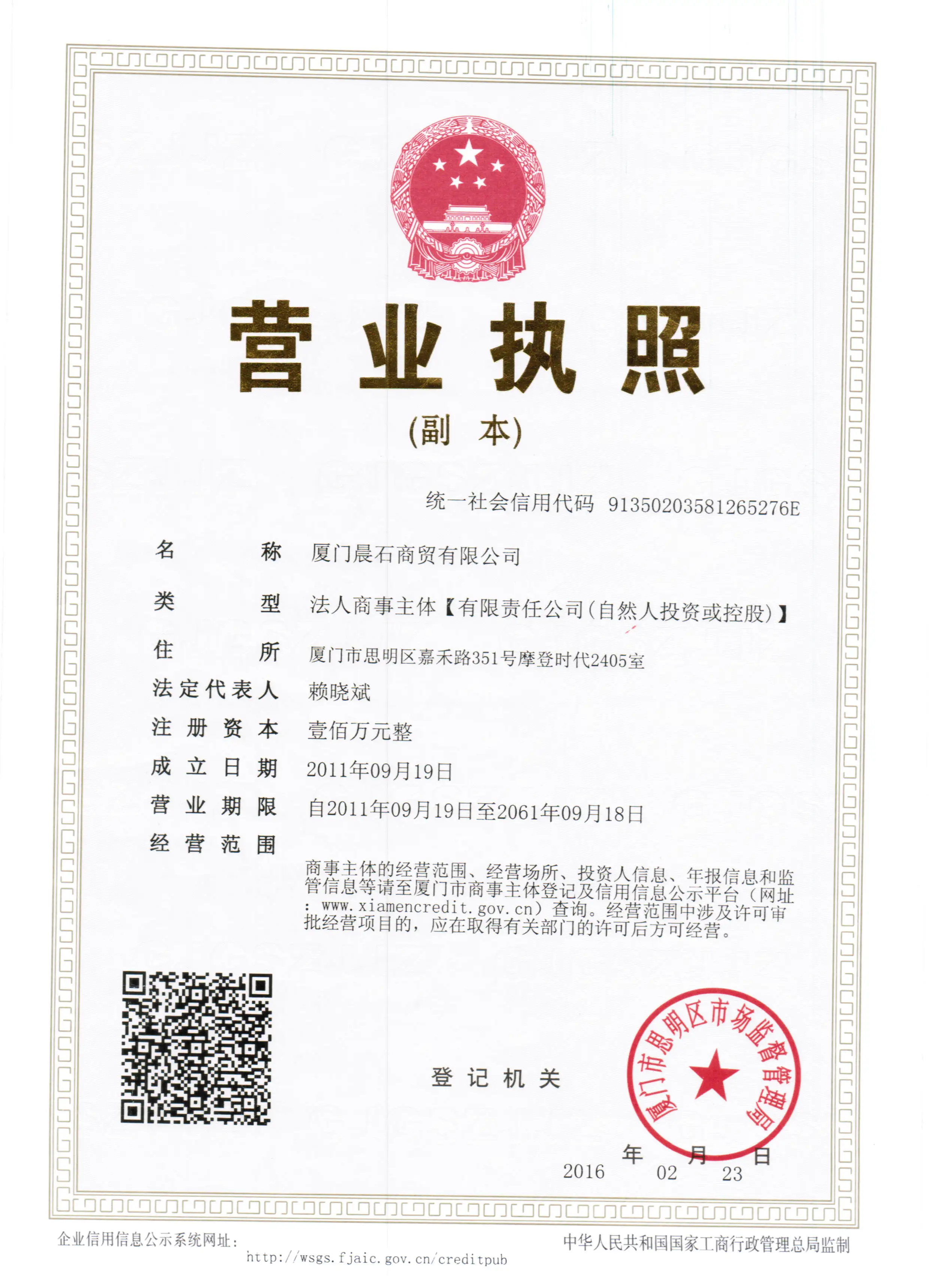 Registered address : Room 2405, Modern Times, No. 351 Jiahe Road Xiamen Fujian China